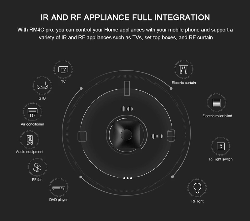 Το RM4 Pro είναι ένα σύστημα τηλεχειρισμού ηλεκτρικών συσκευών IR/RF μέσω της εφαρμογής BroadLink για smartphone. Με το Alexa ή το Google Assistant, σας προσφέρει φωνητικό έλεγχο των συσκευών σας, όπως ενεργοποίηση/απενεργοποίηση της τηλεόρασής σας ή αύξηση/μείωση της έντασης του ήχου. Επιπλέον υποστηρίζει εξωτερική ανίχνευση θερμοκρασίας και υγρασίας του χώρου όπου βρίσκεται η συσκευή.