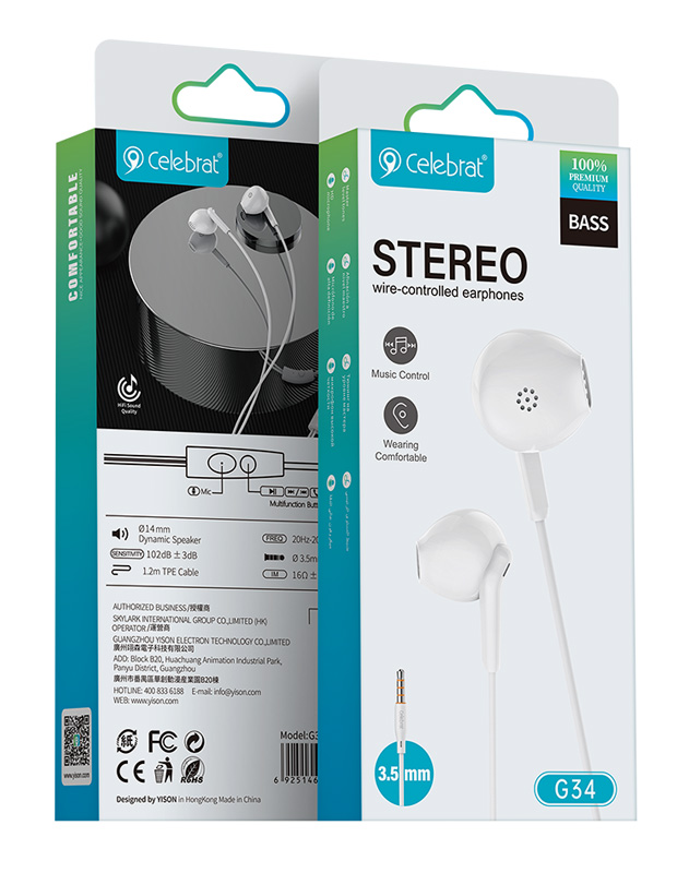 CELEBRAT earphones με μικρόφωνο G34, 3.5mm σύνδεση, 14mm, 1.2m, λευκά