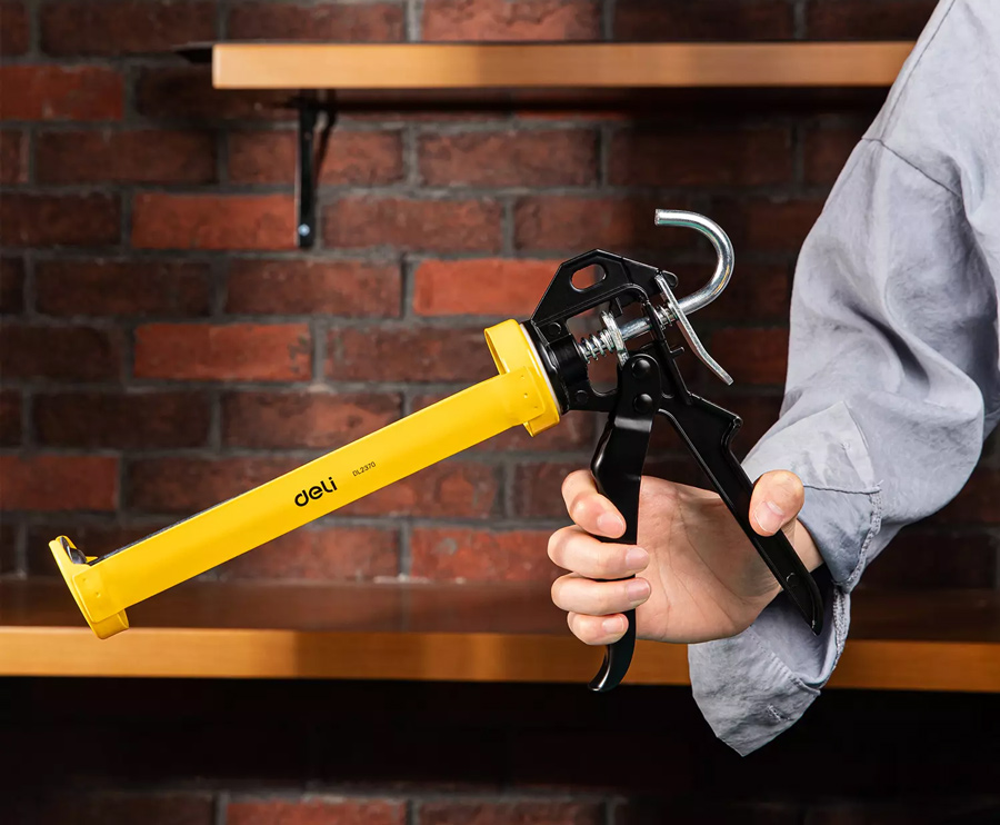 Πιστόλι σιλικόνης DELI ανοικτού τύπου, ιδανικό για φυσίγγια σιλικόνης μήκους έως 230mm. Είναι κατασκευασμένο από ατσάλι και αλουμίνιο υψηλής ποιότητας και διαθέτει εργονομική λαβή.
