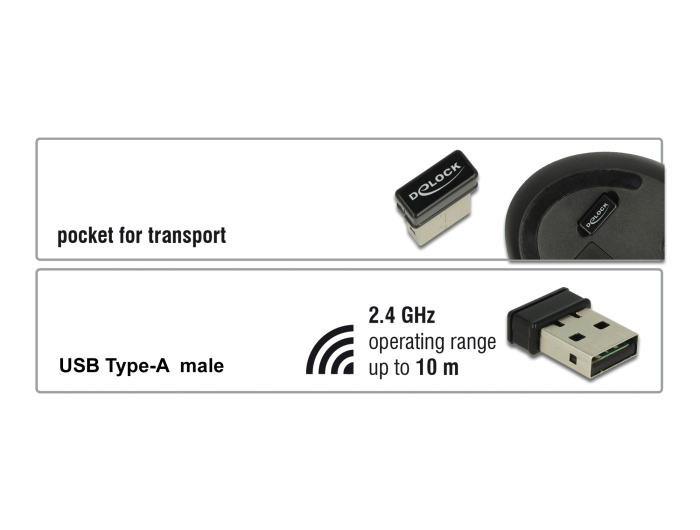 Αυτό το ασύρματο κάθετο ποντίκι της Delock είναι κατάλληλο για δεξιόχειρες και συνδέεται στον υπολογιστή μέσω USB receiver.