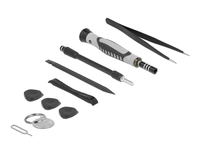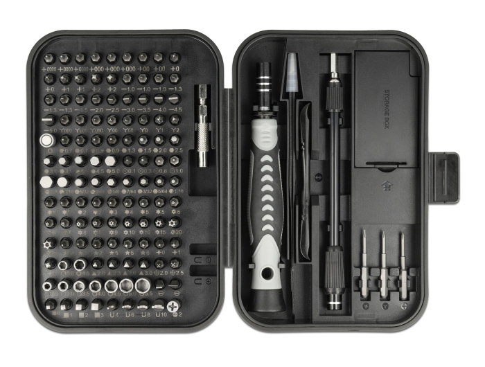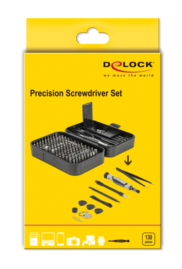 Το σετ κατσαβιδιών ακριβείας της Delock αποτελείται από ένα μαγνητικό κατσαβίδι με εύκαμπτη επέκταση, αντάπτορα 1/4″ σε 5/32″, τσιμπίδα, βεντούζα, καρφίτσα εξαγωγής, 4 εργαλεία ανοίγματος συσκευών και μια μεγάλη συλλογή από 120 μύτες κάθε είδους, τοποθετημένα μέσα σε θήκη με ενσωματωμένο magnetizer/demagnetizer, για την εύκολη τακτοποίηση και μεταφορά τους.