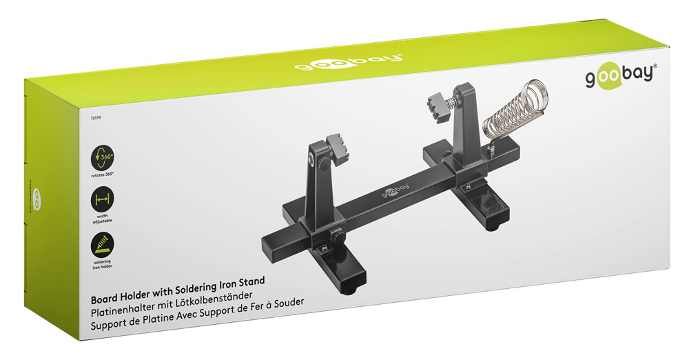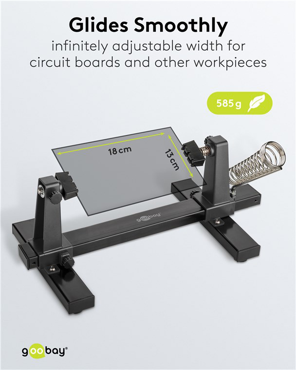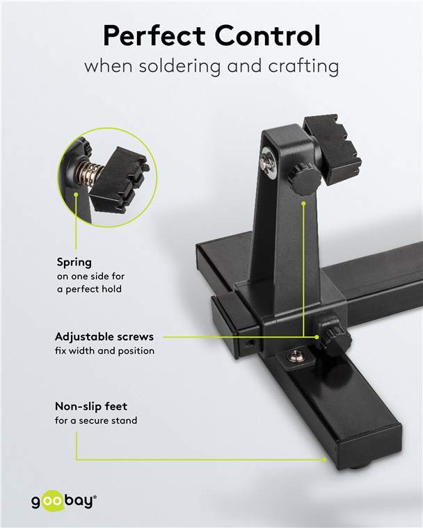 Βάση της Goobay για την στερέωση ηλεκτρονικών εξαρτημάτων όπως πλακέτες, κατάλληλη για εργασίες συγκόλλησης. Η βάση της διαθέτει αντιολισθητικά pads, ενώ, οι πλαστικοί βραχίονες συγκράτησης είναι περιστρεφόμενοι, προσφέροντας μεγαλύτερη σταθερότητα και ευελιξία κατά την εργασία.