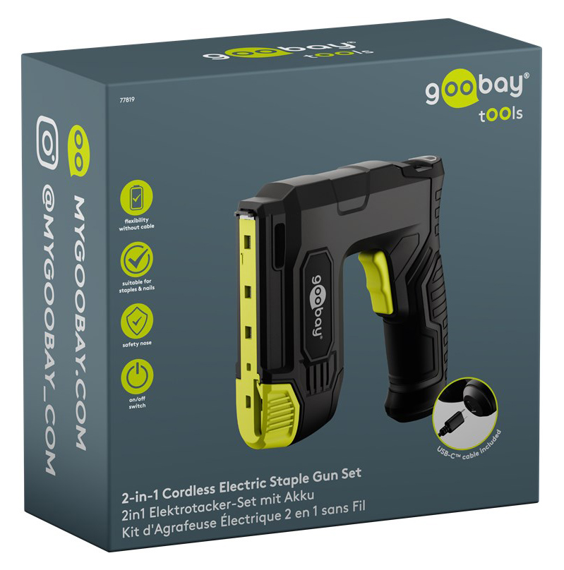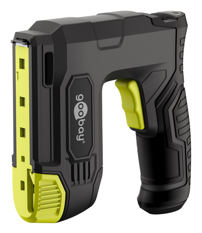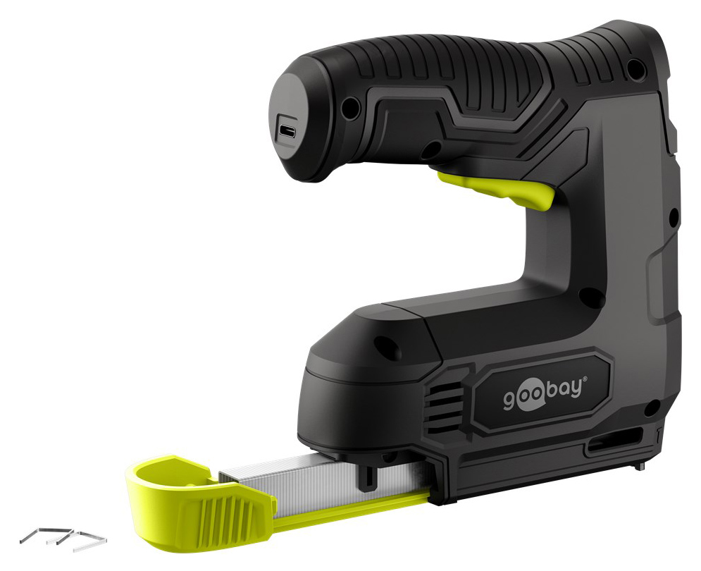 Πρακτικό και ισχυρό, ασύρματο καρφωτικό μπαταρίας της Goobay, ιδανικό για επισκευές/συναρμολογήσεις επίπλων, εργασίες ταπετσαρίας, στερέωση μονωτικών υλικών ή σοβατεπιών και DIY εφαρμογές.