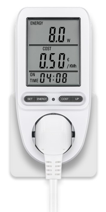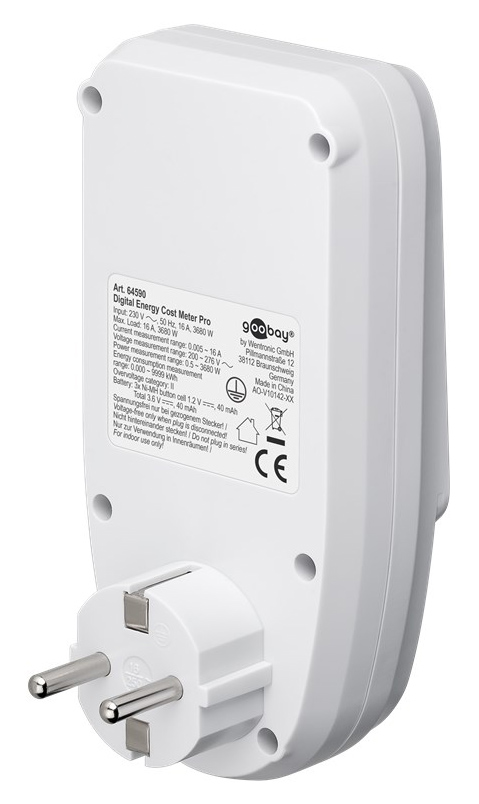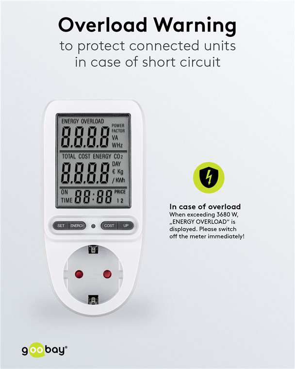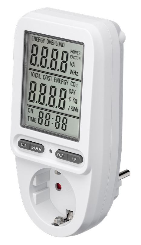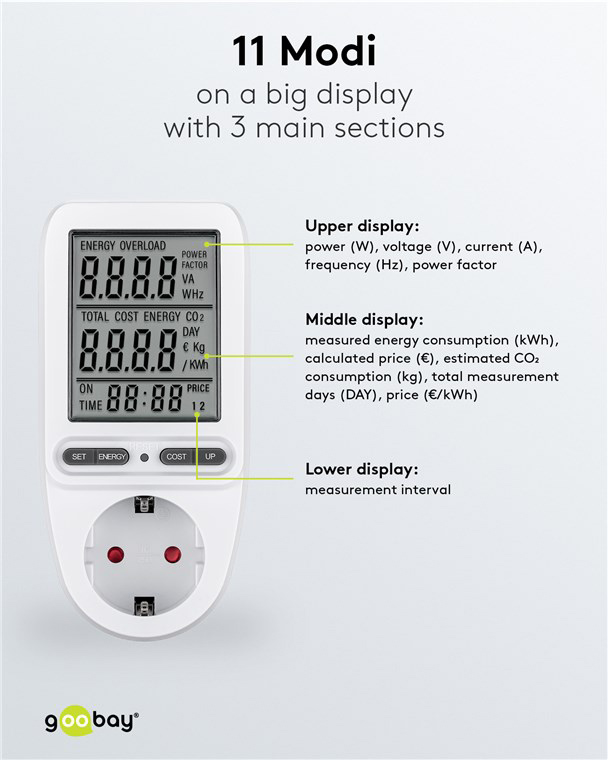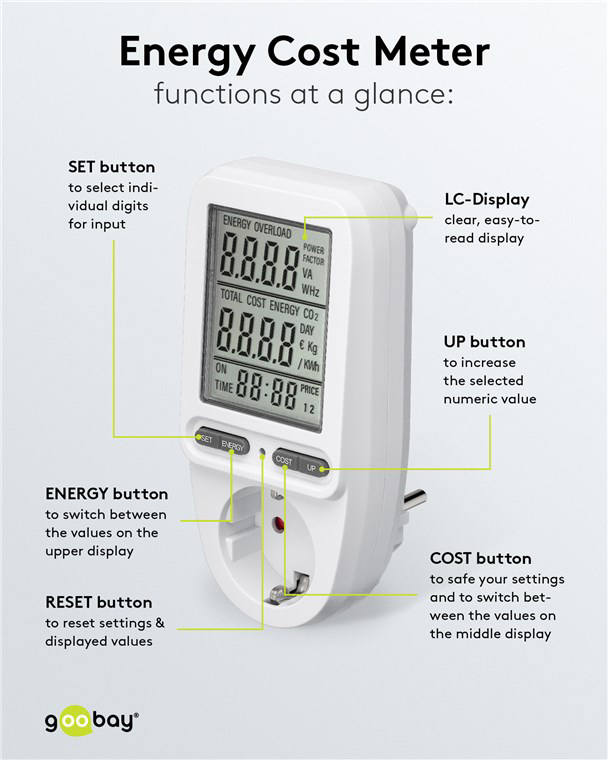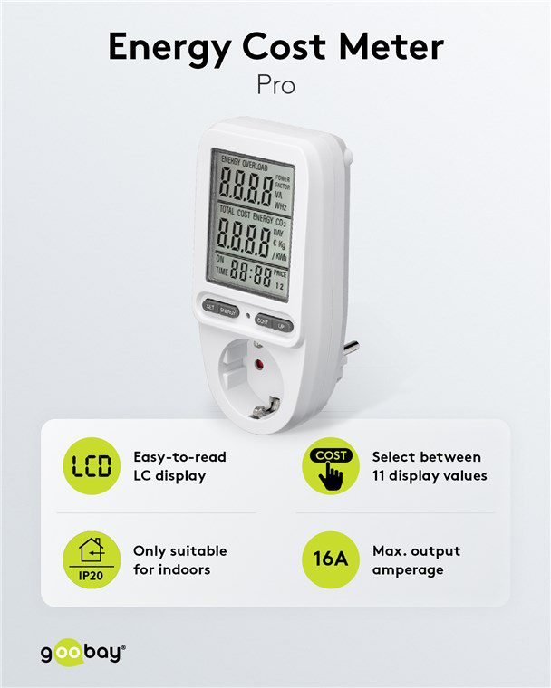Μετρητής της Goobay για τη μέτρηση της κατανάλωσης ρεύματος των συνδεδεμένων οικιακών ηλεκτρικών συσκευών. Ενσωματώνει ευανάγνωστη οθόνη που σας επιτρέπει να παρακολουθείτε την κατανάλωση του ρεύματος κόστος σε ευρώ/kWh αλλά και τον χρόνο κατανάλωσης. Τα δεδομένα μπορούν να αποθηκευτούν για έως 20 λεπτά μετά την αποσύνδεση της συσκευής, επιτρέποντας σας την εναλλαγή διαφορετικών ηλεκτρικών συσκευών χωρίς να χάσετε τα δεδομένα.