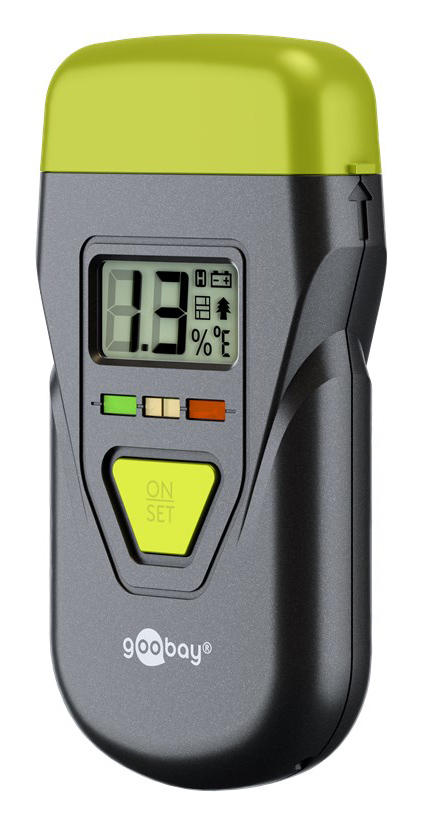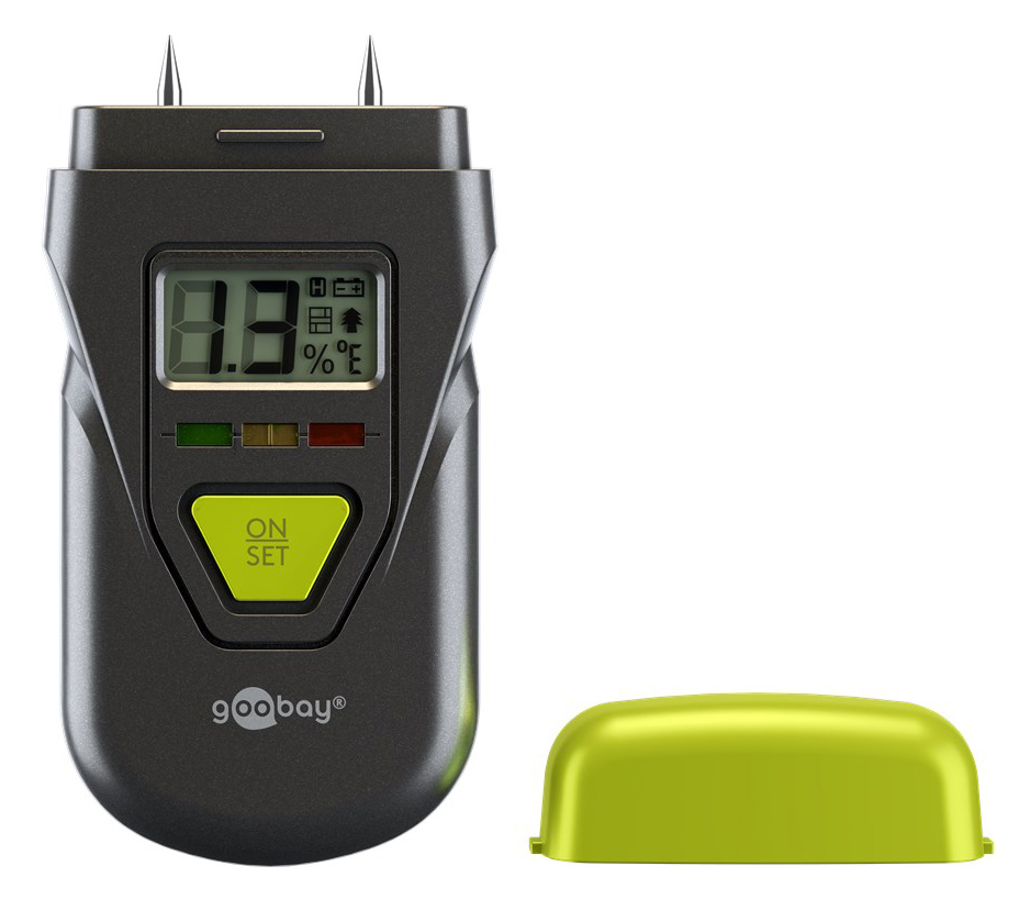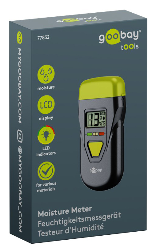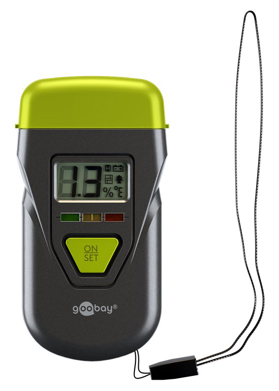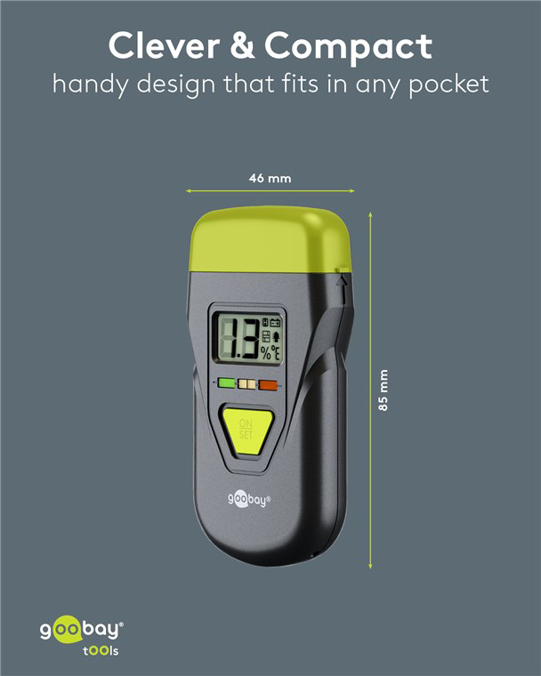 Ψηφιακό θερμόμετρο και υγρασιόμετρο της Goobay, ιδανικό για μέτρηση υγρασίας και θερμοκρασίας σε υλικά όπως ξύλο, μπετόν, τοίχους και άλλα δομικά στοιχεία. Χάρη στον compact σχεδιασμό του, αποτελεί πρακτικό εργαλείο για τεχνικούς, εργασίες ανακαίνισης ή ελέγχους υγρασίας σε εσωτερικούς χώρους.