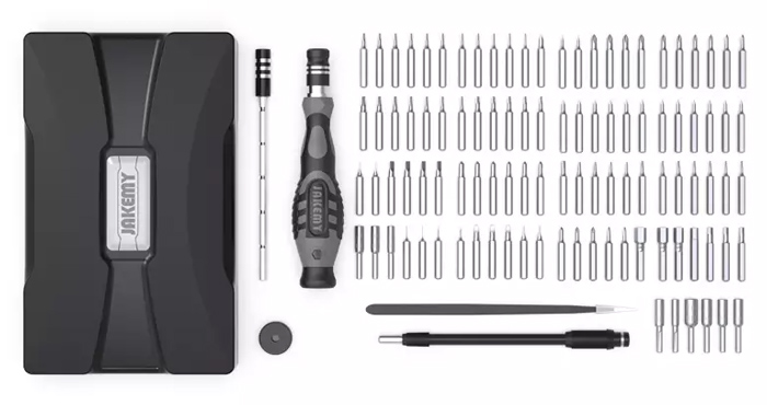 Σετ κατσαβιδιών της Jakemy το οποίο αποτελείται από κατσαβίδι, προέκταση, μαγνητιστή, τσιμπίδα και 30 διαφορετικές μύτες κατσαβιδιού.