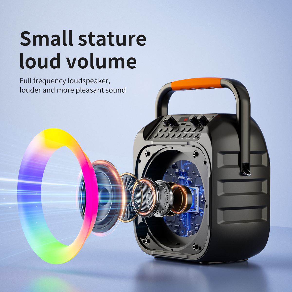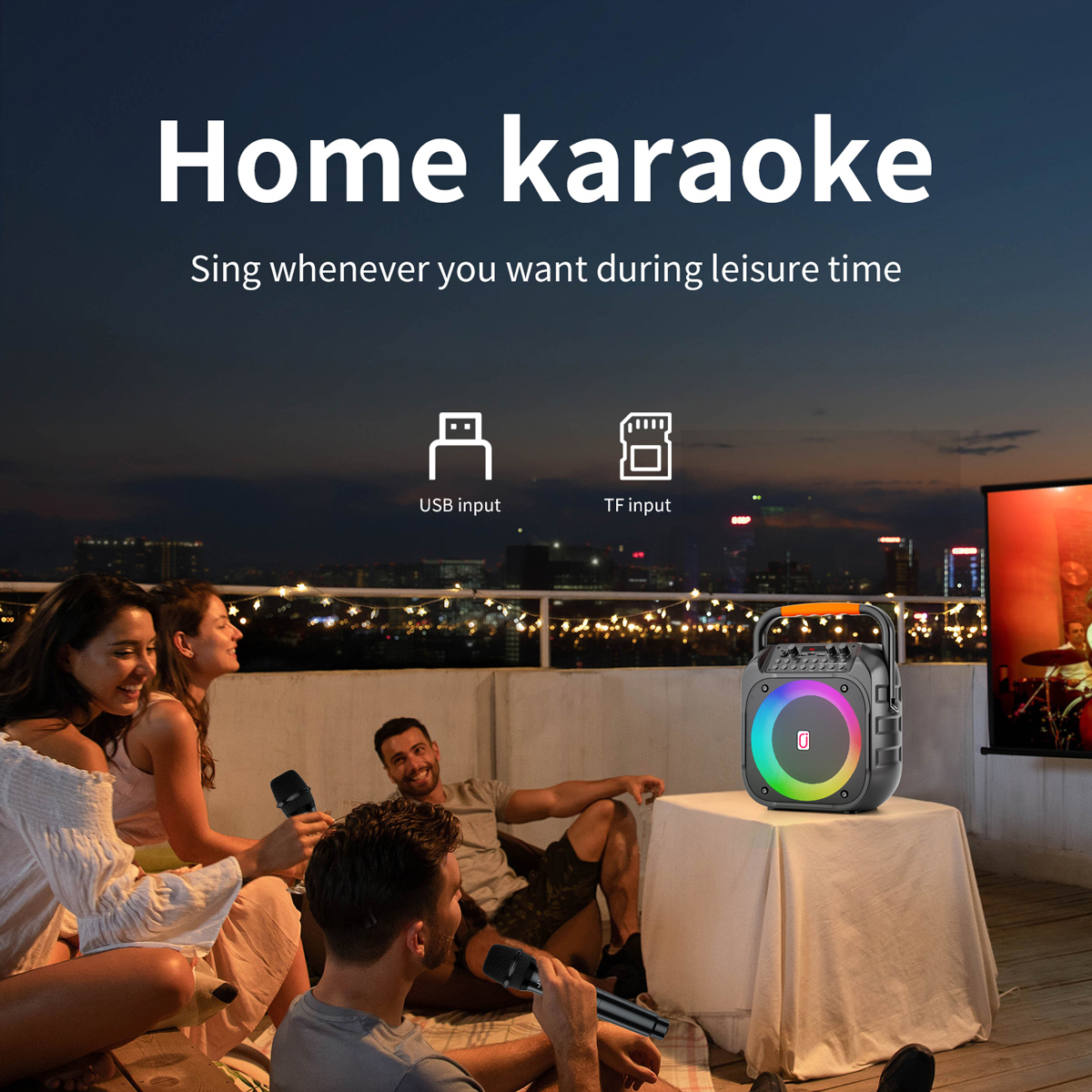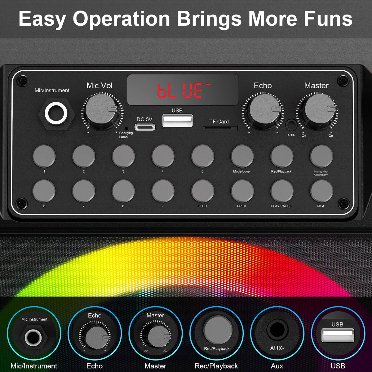 Διαθέτει κομψό πολύχρωμο φωτισμό με ρυθμιζόμενα εφέ και πλήκτρα με αριθμούς για αριθμημένη επιλογή τραγουδιού (υποστηρίζεται μόνο σε micro SD και USB flash drive).