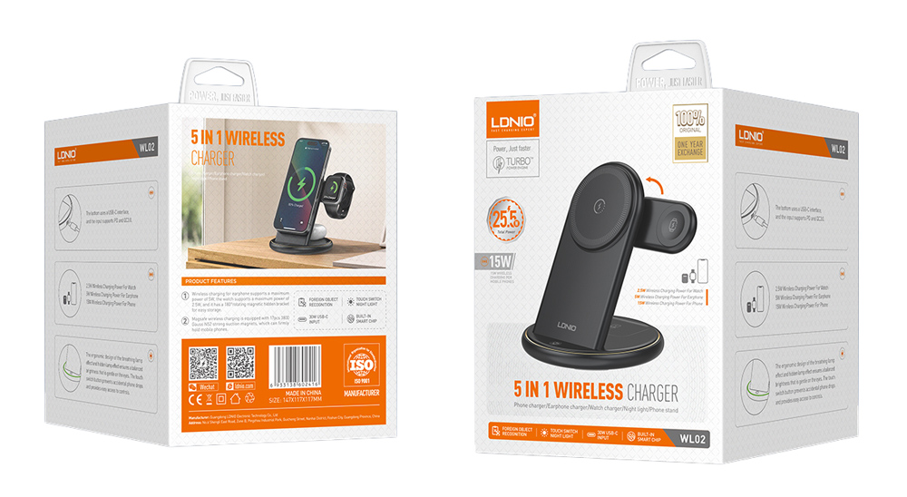 LDNIO ασύρματος φορτιστής WL02 με LED φωτισμό, 3 σε 1, 15W, μαύρος