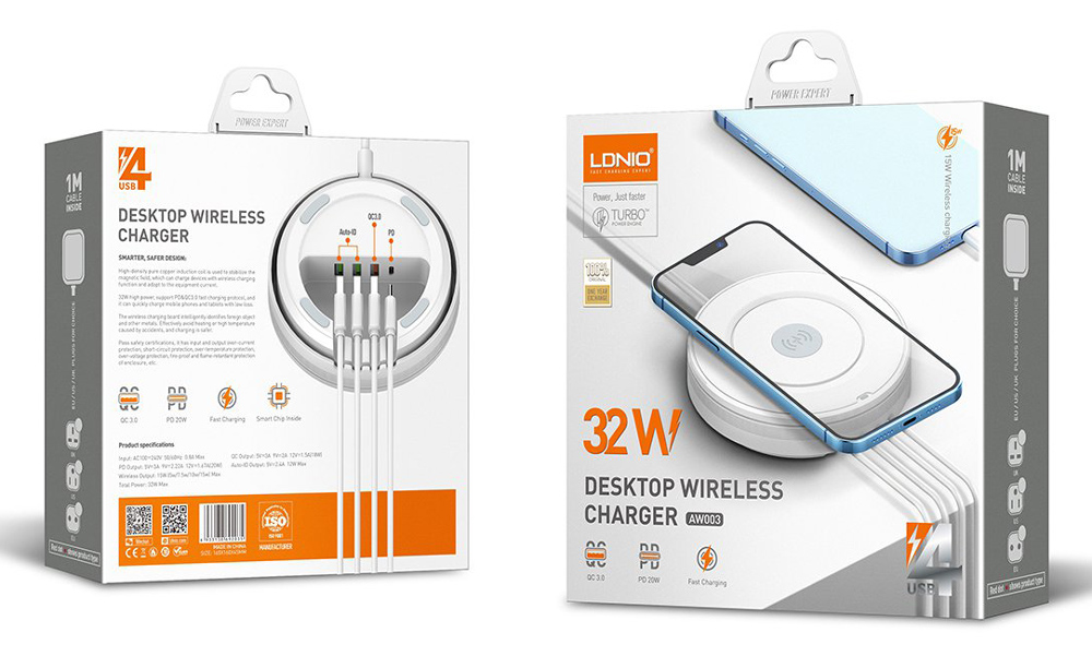 LDNIO σταθμός φόρτισης AW003, USB-C/3x USB/wireless, 32W, PD/QC, λευκός