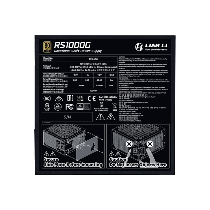 Η παγκόσμια καινοτομία της Lian Li επιτρέπει στην υποδοχή ρεύματος να περιστρέφεται κατά 90 μοίρες. Αυτό επιτρέπει την τοποθέτηση του τροφοδοτικού τόσο σε οριζόντια όσο και σε κάθετη διάταξη, διευκολύνοντας την πρόσβαση σε στενά κουτιά (cases).