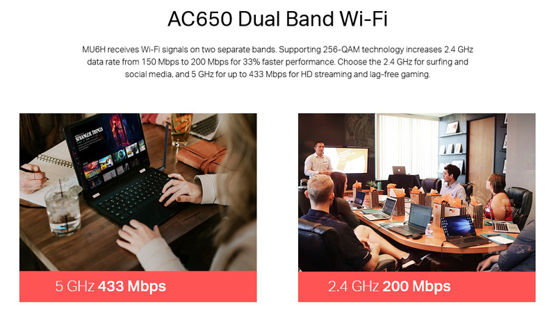 Το MU6H της Mercusys λαμβάνει σήματα Wi-Fi σε δύο ξεχωριστές ζώνες. Η υποστήριξη 256QAM αυξάνει το ρυθμό δεδομένων 2.4 GHz από 150 Mbps σε 200 Mbps, παρέχοντας 33% ταχύτερη απόδοση. Οι ταχύτητες 200 Mbps στη ζώνη 2.4 GHz είναι ιδανικές για κανονική χρήση, όπως η περιήγηση στο διαδίκτυο με παλαιότερες συσκευές. Οι ταχύτητες των 433 Mbps στη ζώνη των 5 GHz είναι ιδανικές για ροή HD και διαδικτυακά παιχνίδια χωρίς καθυστέρηση.