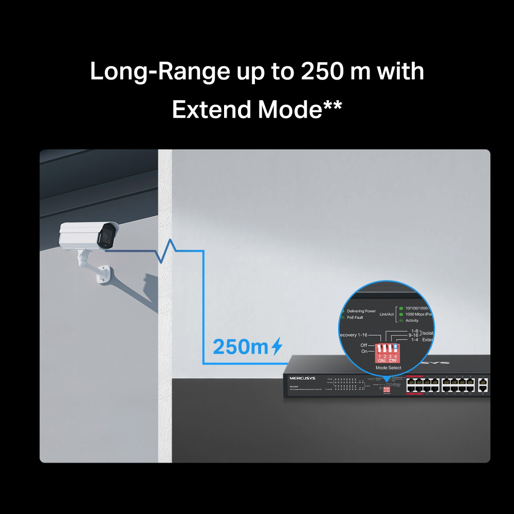 Λειτουργία extend mode για μετάδοση PoE έως 250 μέτρα, ιδανική για συστήματα επιτήρησης.