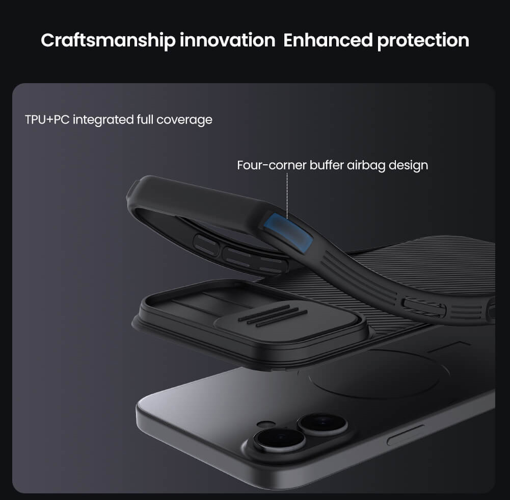 Η θήκη της σειράς CamShield Pro της Nillkin χαρακτηρίζεται από την ενισχυμένη προστασία που προσφέρει, το σκληρό υλικό κατασκευής της με την ανάγλυφη επιφάνεια, αλλά και την έξτρα προστασία των καμερών και της ιδιωτικότητας σας, χάρη στο συρόμενο καπάκι της.