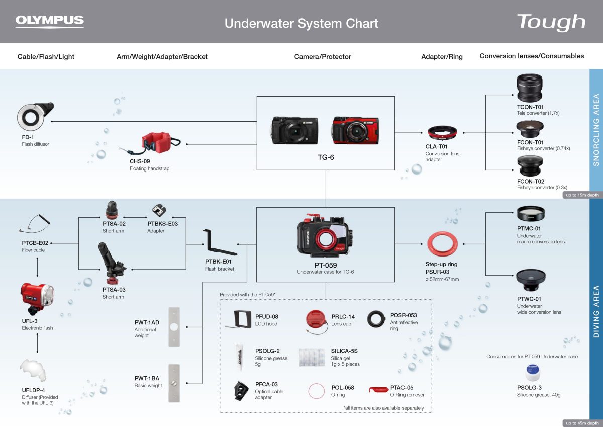 Κατά τις πολύ κοντινές λήψεις με χρήση μηχανών εναλλάξιμων φακών, χρησιμοποιείται ένας δακτύλιος φλας με πομπό γύρω από το φακό, για να αποφευχθεί η σκίαση του θέματος από τη μηχανή. Παρόμοια αποτελέσματα μπορούν να επιτευχθούν με τον Οδηγό φωτισμού LED. Ο Οδηγός φωτισμού LED, LG‑1, μπορεί να προσαρμοστεί στο φακό των συμβατών φωτογραφικών μηχανών της σειράς TG και χρησιμοποιεί την ενσωματωμένη λυχνία LED για ομοιόμορφο φωτισμό του θέματος, αξιοποιώντας στο έπακρο τις δυνατότητες λήψης macro της σειράς TG.