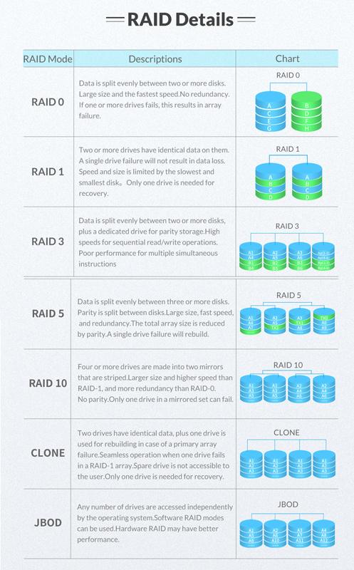 RAID modes: RAID 0, 1, 3, 5, 10, JBOD, CLONE