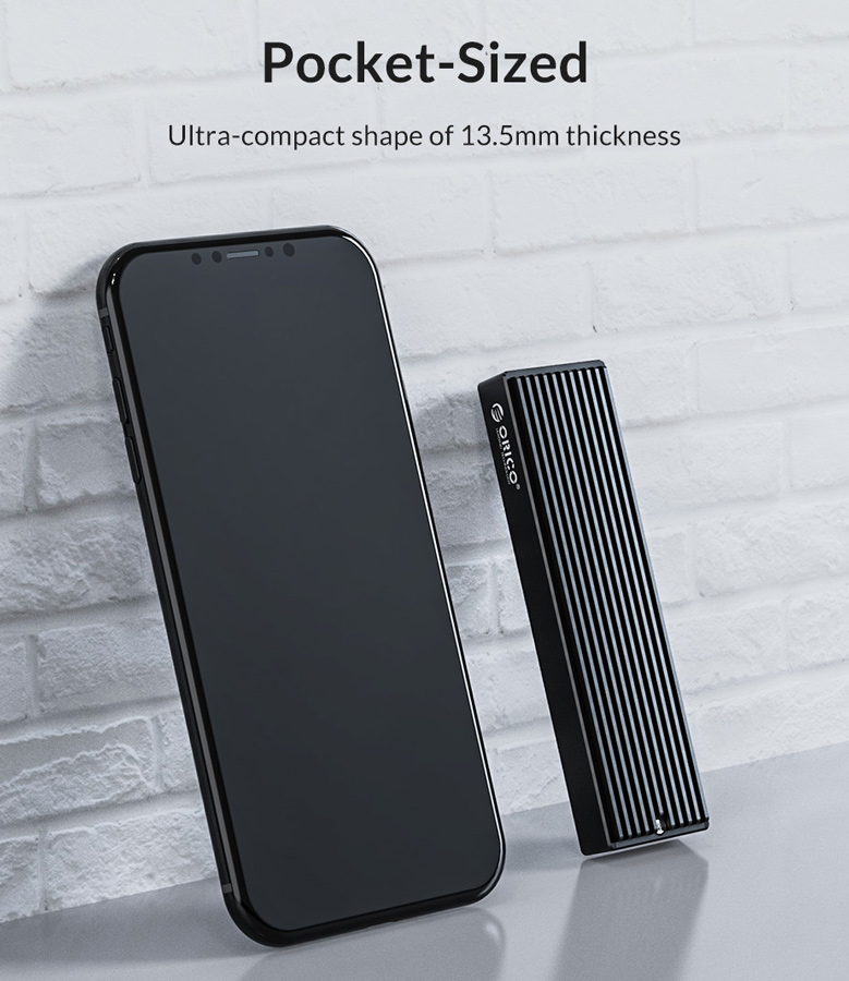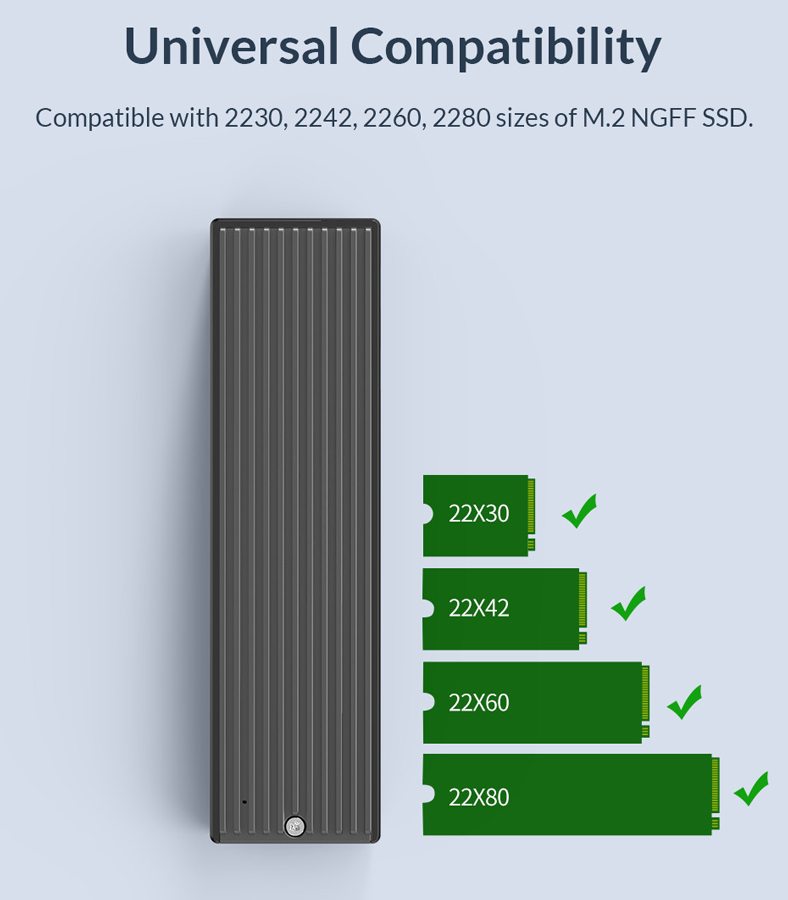 Θήκη για M.2 SSD με interface B key, η οποία μπορεί να συνδεθεί μέσω θύρας USB στον υπολογιστή, την τηλεόραση ή το κινητό σας (μέσω OTG). Είναι συμβατή με 4 μεγέθη M.2: 2230, 2242, 2260 και 2280.