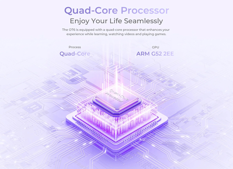 Εξοπλισμένο με επεξεργαστή 4 πυρήνων RK3562 και γραφικά ARM G52 2EE, το OT6 προσφέρει την ισχύ που χρειάζεστε για απρόσκοπτη περιήγηση στο διαδίκτυο, παιχνίδια, πολυμέσα και πολλά άλλα.