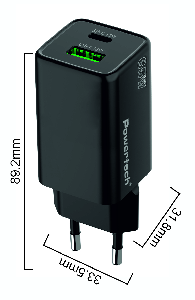 Υψηλής απόδοσης φορτιστής τοίχου της Powertech, κατασκευασμένος από ανθεκτικό υλικό και συμβατός με συσκευές που φορτίζουν μέσω θύρας USB. Διαθέτει USB και USB-C θύρες εξόδου που υποστηρίζουν φόρτιση με μέγιστη απόδοση 65W.