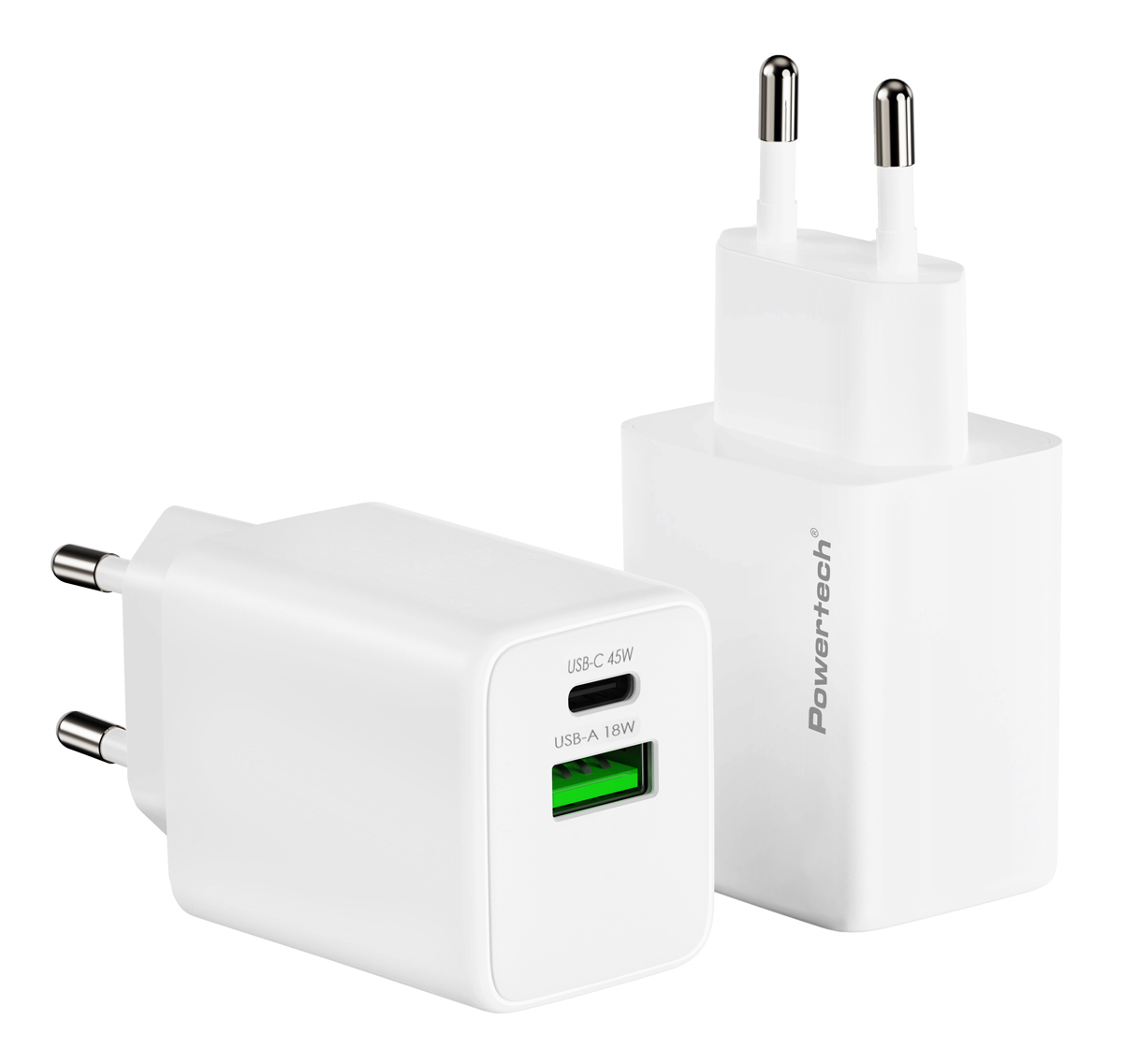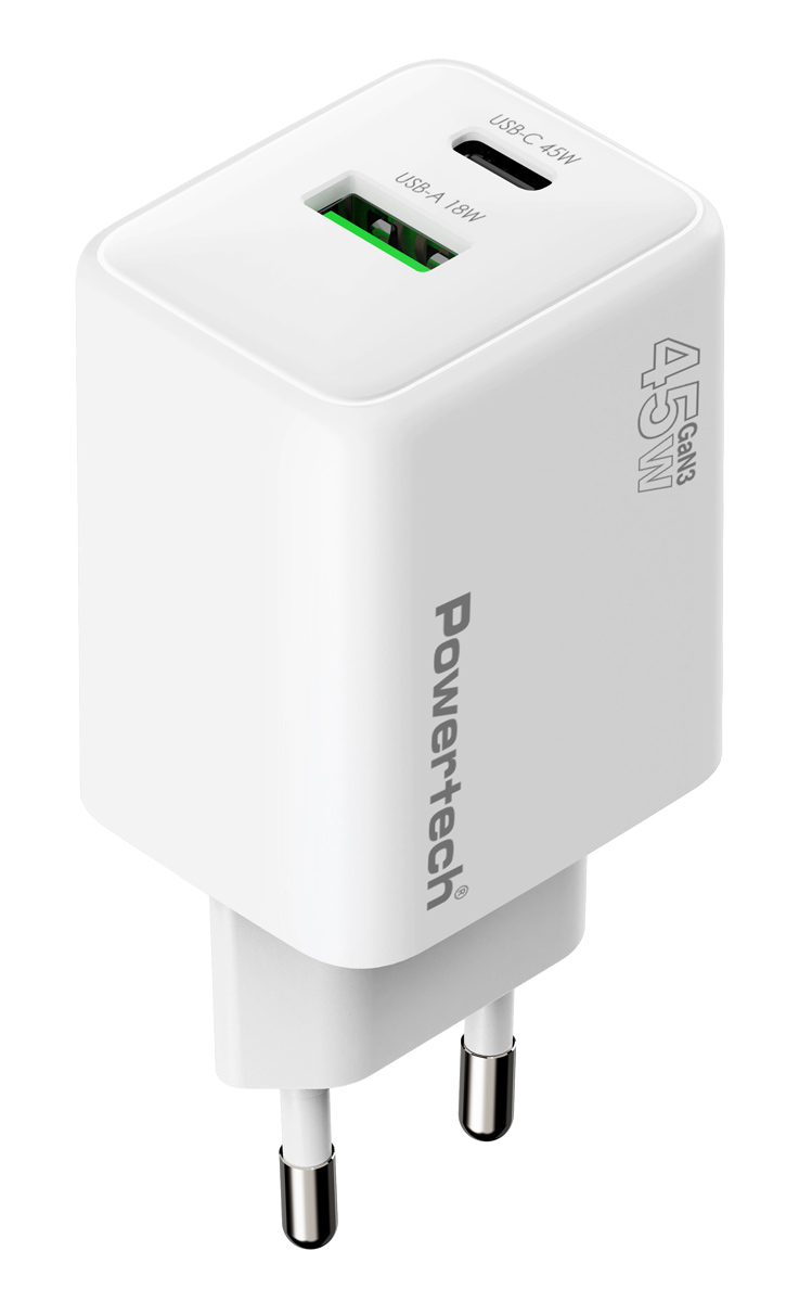 Υψηλής απόδοσης φορτιστής τοίχου της Powertech, κατασκευασμένος από ανθεκτικό υλικό και συμβατός με συσκευές που φορτίζουν μέσω θύρας USB. Διαθέτει USB και USB-C θύρες εξόδου που υποστηρίζουν φόρτιση με μέγιστη απόδοση 45W.