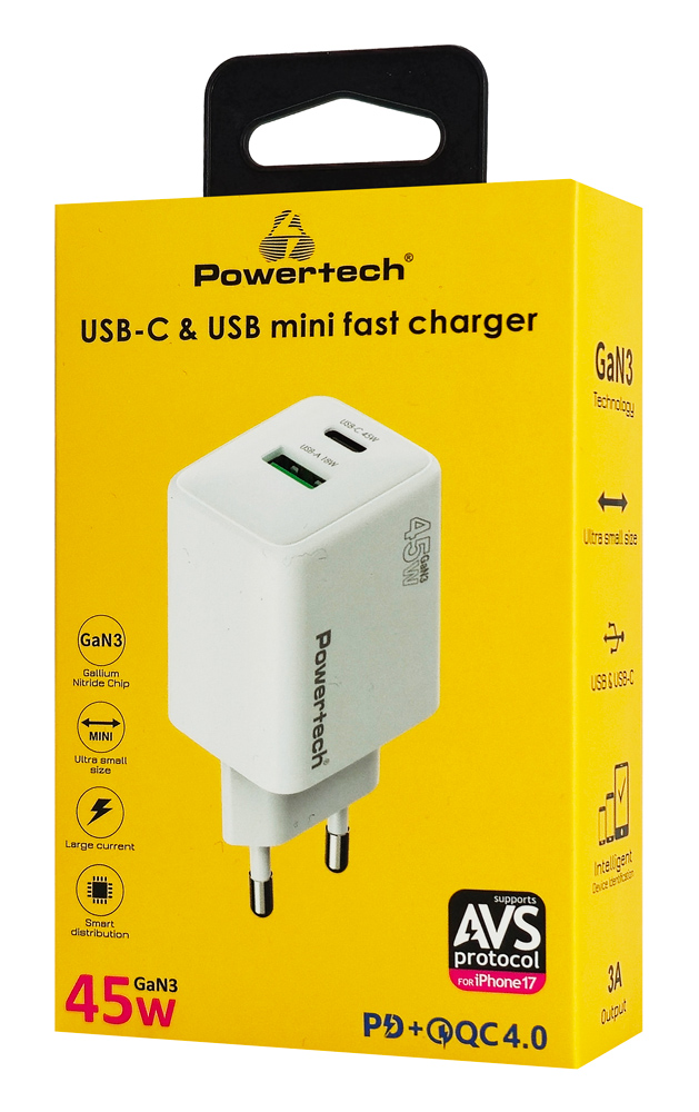 POWERTECH φορτιστής τοίχου PT-1551, USB/USB-C, 45W, GaN, AVS, λευκός