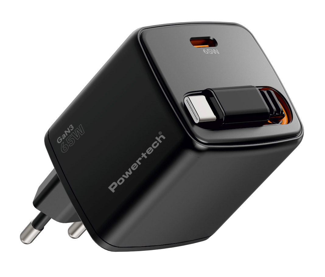 POWERTECH φορτιστής τοίχου PT-1573 με πτυσσόμενο καλώδιο, USB-C, 65W, GaN, μαύρος