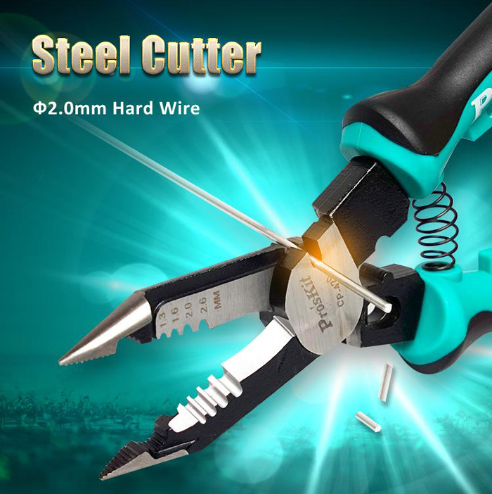 Πολυλειτουργική πένσα της PROSKIT, κατάλληλη για την απογύμνωση και διαχωρισμό καλωδίων, κοπή συρμάτων, πτύχωση τερματικών και σύσφιξη παξιμαδιών.