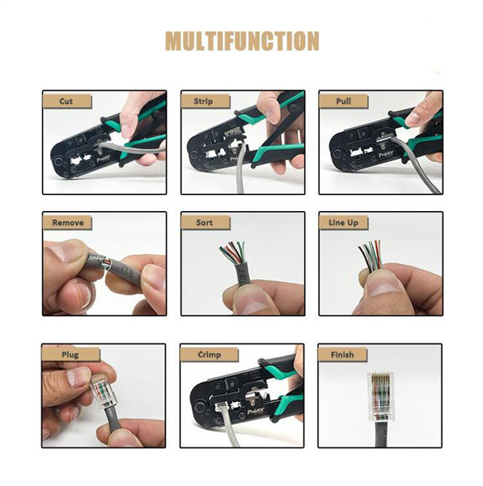 Πρέσα ακροδεκτών της PROSKIT, ιδανική για κοπή, απογύμνωση και πτύχωση καλωδίων δικτύου.