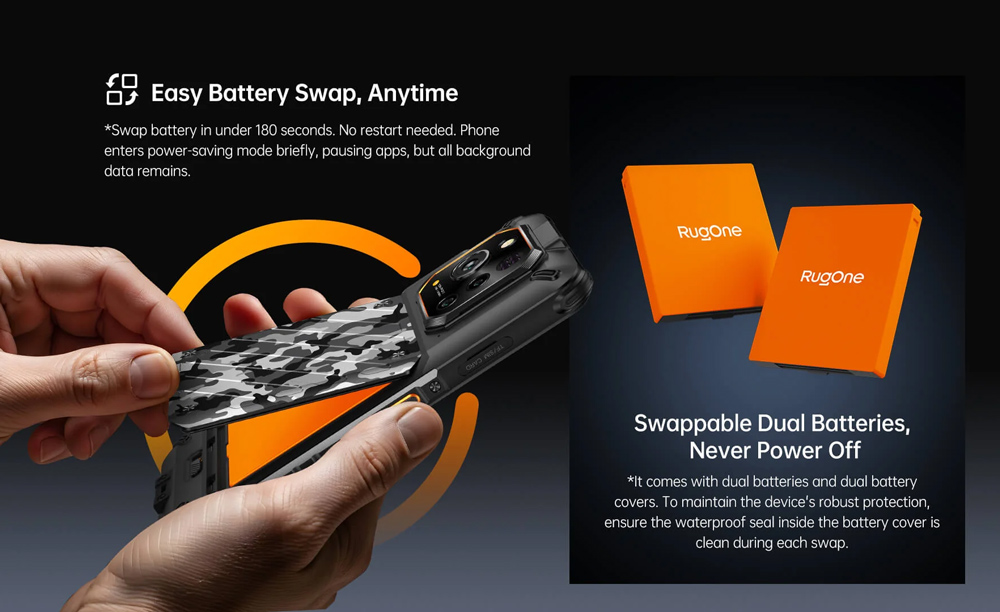 Η συσκευή διαθέτει 2 αφαιρούμενες μπαταρίες για αδιάκοπη χρήση, καθώς και βάση φόρτισης που επιτρέπει την ταυτόχρονη φόρτιση του smartphone και της δεύτερης μπαταρίας.