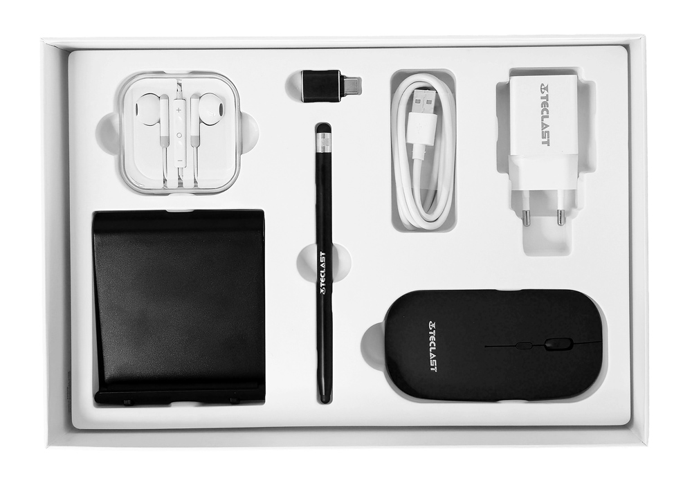 Στη συσκευασία συμπεριλαμβάνονται θήκη τύπου flip, πληκτρολόγιο, ασύρματο ποντίκι, στυλό αφής, βάση και ακουστικά, προσφέροντας έτοιμη λύση για εργασία και ψυχαγωγία.