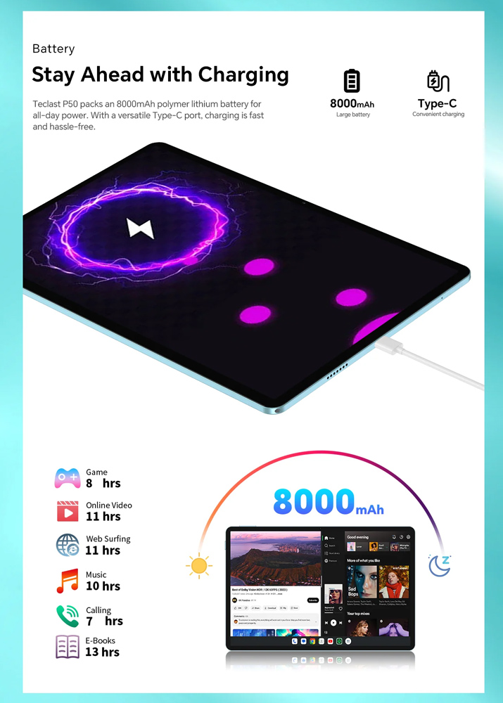 Η μπαταρία χωρητικότητας 8000mAh προσφέρει μεγάλη αυτονομία που θα σας απαλλάξει από τις συχνές αναζητήσεις τροφοδοσίας.