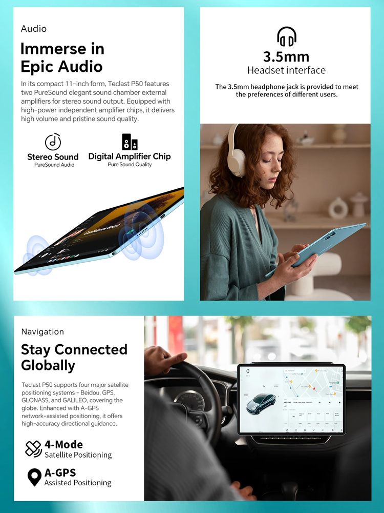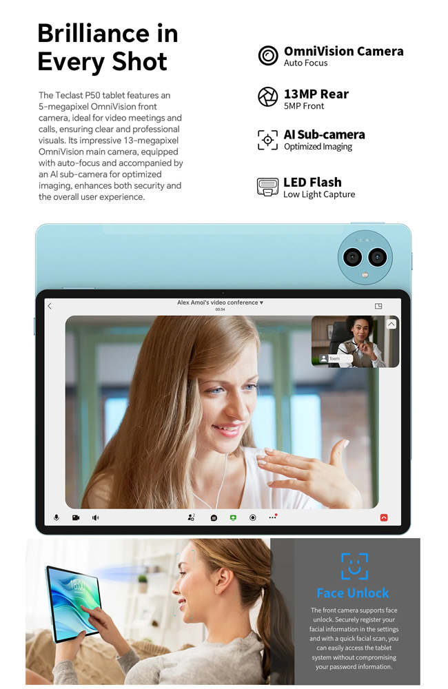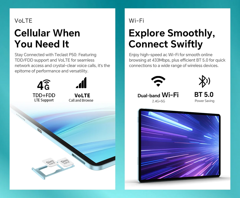 Με υποστήριξη διπλής κάρτα SIM και δικτύου 4G, το tablet P50 σας επιτρέπει να παραμείνετε συνδεδεμένοι όπου κι αν βρίσκεστε. Επιπλέον, η τεχνολογία WiFi σας εξασφαλίζει γρήγορη και αξιόπιστη ασύρματη σύνδεση.