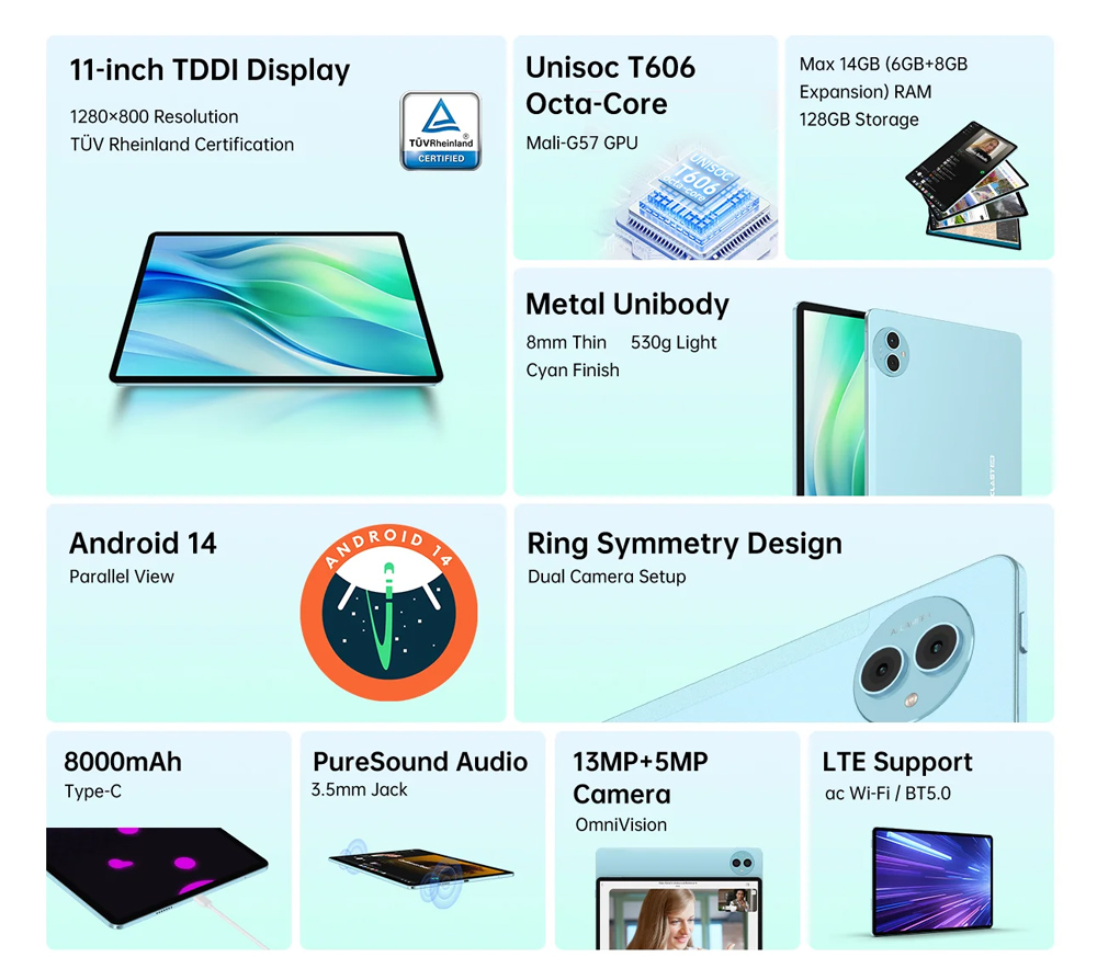 TECLAST tablet P50, 11″, 6/128GB, 4G, Android 14, 8000mAh, μπλε