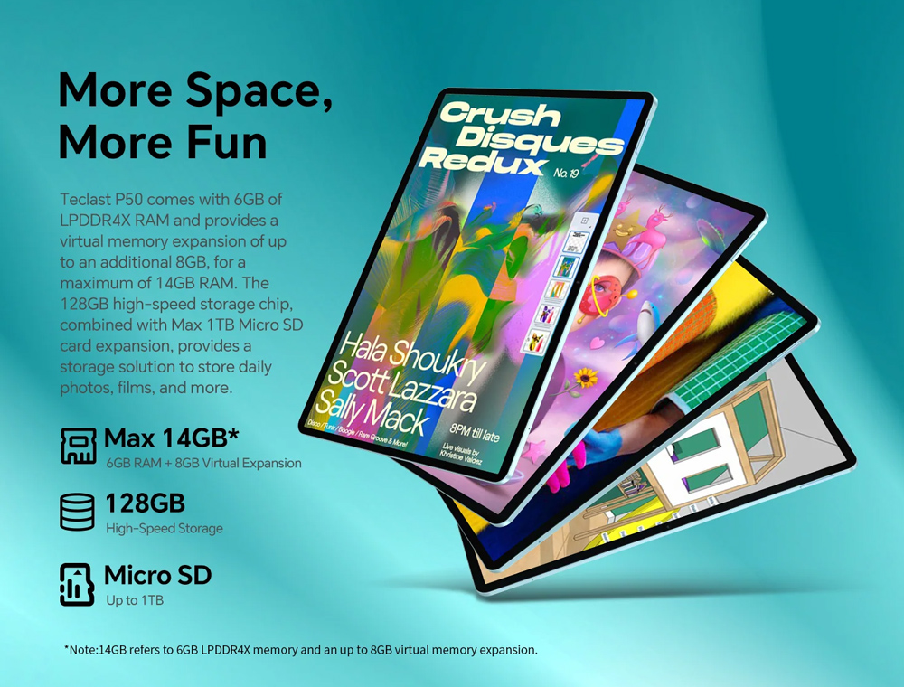 Με 6GB (+8GB virtual) RAM και 128GB ROM για να αποθηκεύετε τα αγαπημένα σας αρχεία, φωτογραφίες και βίντεο. Επιπλέον, προσφέρει την δυνατότητα να επεκτείνετε τον χώρο αποθήκευσης του tablet με κάρτα micro SD έως 1TB.