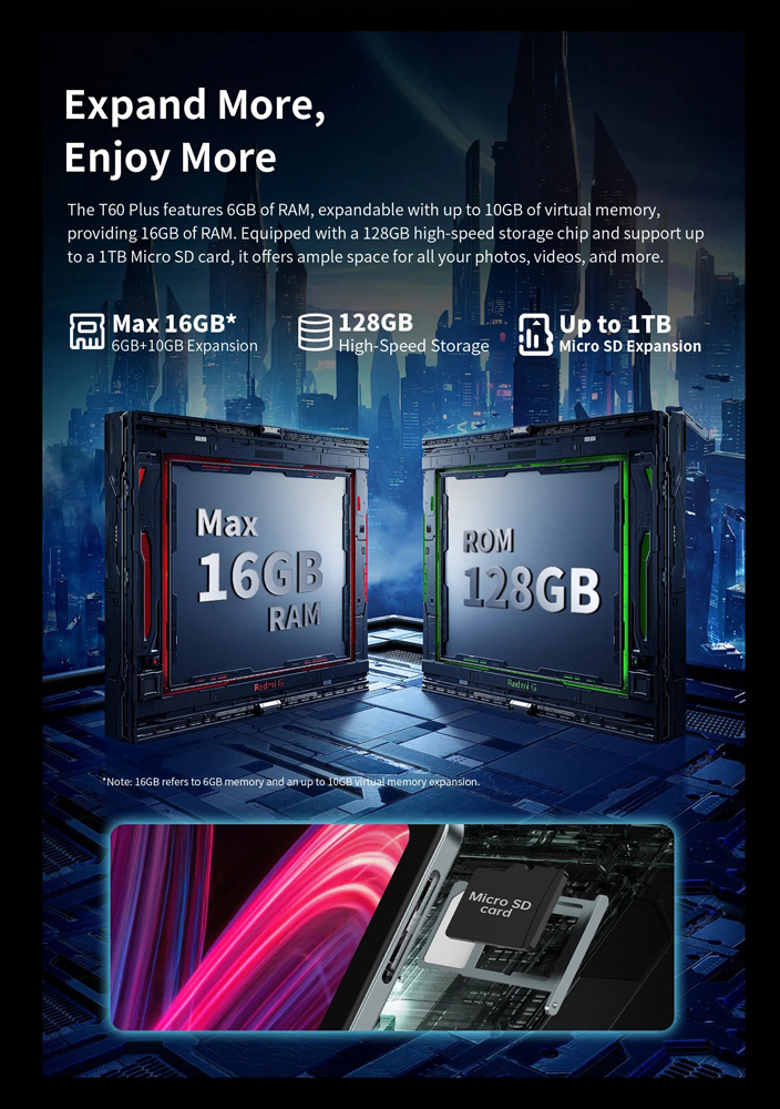 Με 6GB (+10GB virtual) RAM και 128GB ROM για να αποθηκεύετε τα αγαπημένα σας αρχεία, φωτογραφίες και βίντεο. Επιπλέον, προσφέρει την δυνατότητα να επεκτείνετε τον χώρο αποθήκευσης του tablet με κάρτα micro SD έως 1TB.