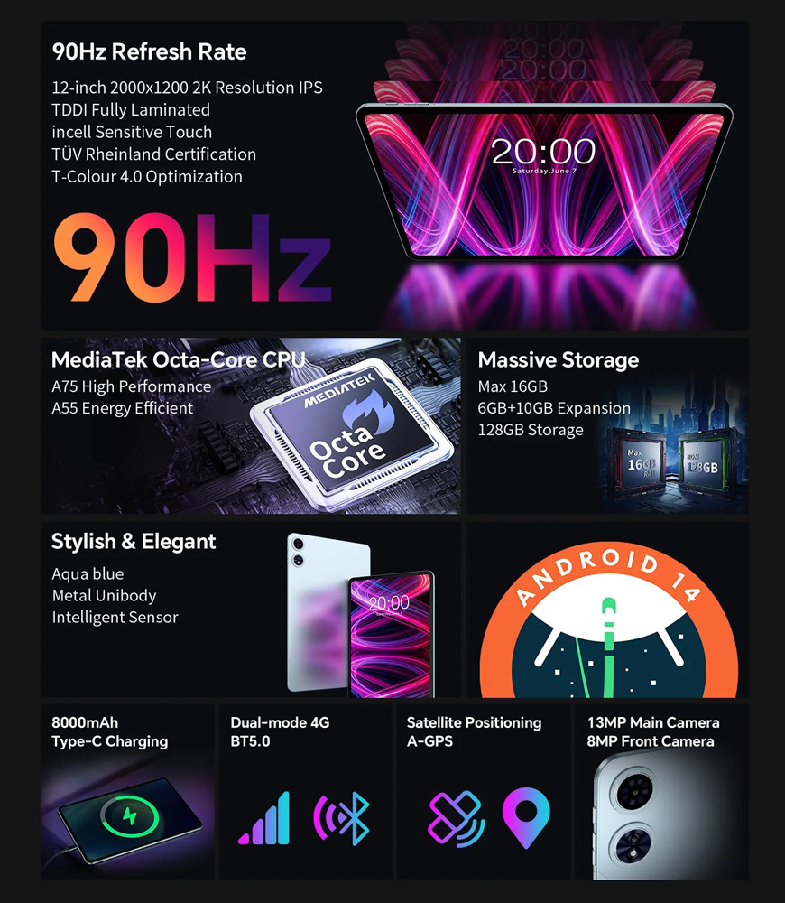TECLAST tablet T60 Plus, 12″, 6/128GB, 4G, Android 14, 8000mAh, μπλε