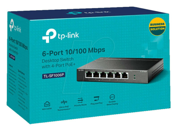 Το TL-SF1006P είναι ένα switch επαγγελματικών προδιαγραφών που εξοπλίζεται με 6 θύρες δικτύου με ταχύτητες 10/100Mbps. Από τις θύρες δικτύου που εξοπλίζεται, οι 4 υποστηρίζουν PoE+ για την μεταφορά δεδομένων και ισχύς με ένα μόνο καλώδιο.