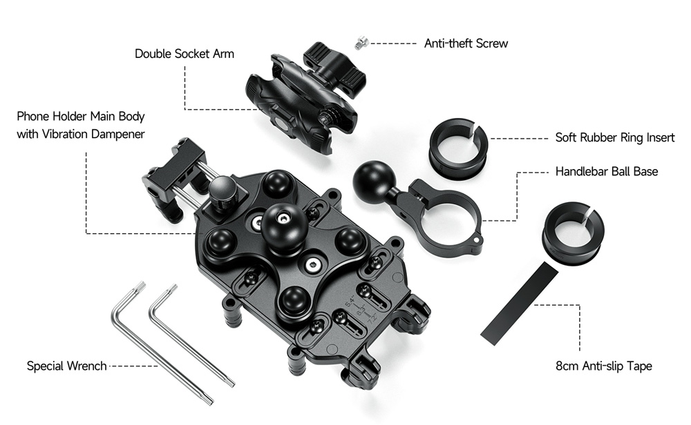 Στιβαρή βάση για smartphone με στήριξη σε τιμόνι ποδηλάτου ή μηχανής της Ulefone. Είναι κατασκευασμένη από ανθεκτικό υλικό ενώ η επιφάνεια στις άκρες της βάσης όπου στηρίζεται η συσκευή αλλά και η βάση στήριξης στο τιμόνι έχει αντιολισθητική και μαλακή επίστρωση από σιλικόνη ώστε να βελτιώνεται το επίπεδο συγκράτησης, αποτρέποντας τις γρατσουνιές από την χρήση. Διαθέτει αντικραδασμικά στοιχεία και μπορεί να τοποθετηθεί σε τιμόνια διαμέτρου 0.87″, 1″ & 1.26″ χάρη στο μεταβαλλόμενο βραχίονα που διαθέτει.