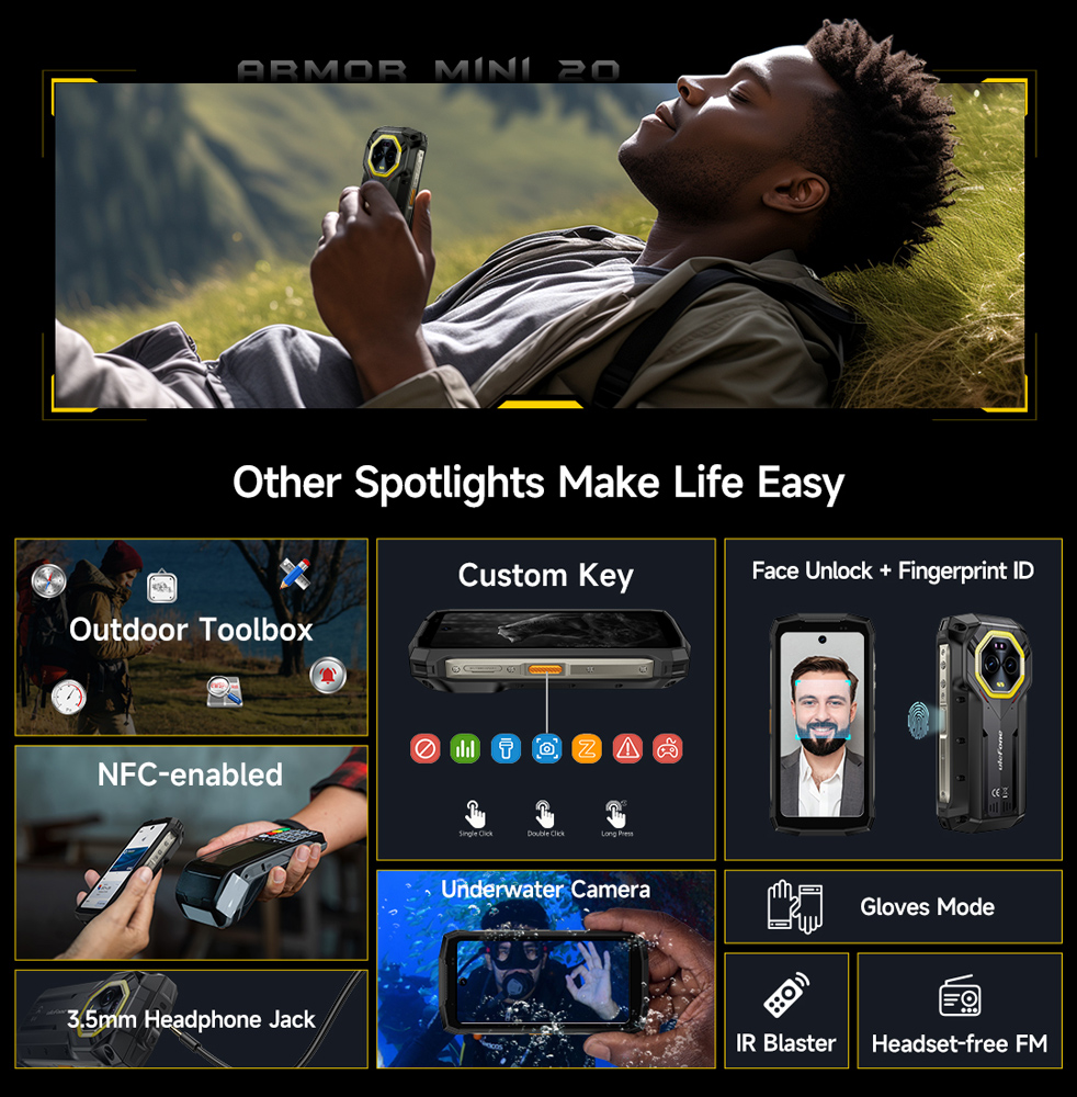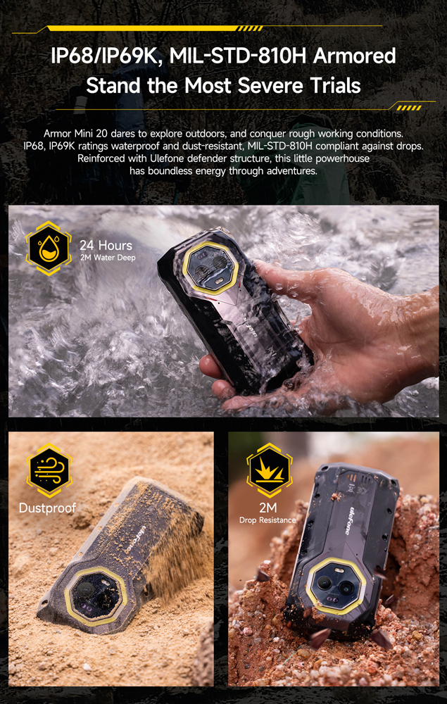 Με βολικό μέγεθος τσέπης, πιστοποίηση IP68/IP69K και πρότυπο MIL-STD-810H, το Armor Mini 20 είναι σχεδιασμένο για να αντέχει σε ακραίες συνθήκες χρήσης και περιβάλλοντα.