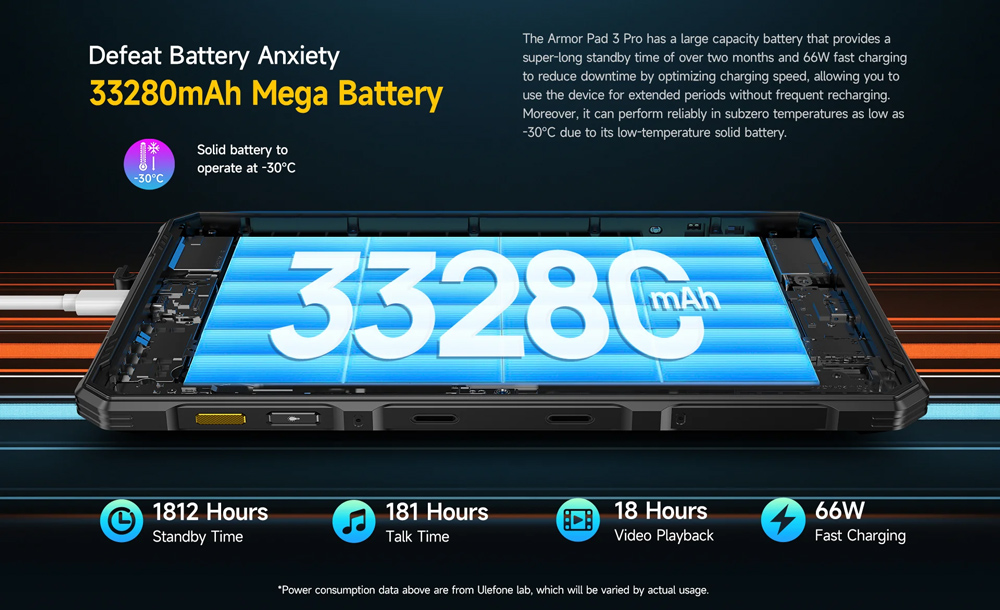Με μπαταρία 33280mAh, το Armor Pad 3 Pro προσφέρει μεγάλη αυτονομία, που θα σας απαλλάξει από τις συχνές αναζητήσεις τροφοδοσίας.