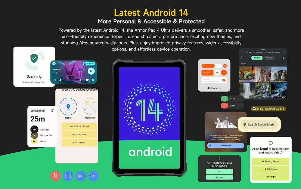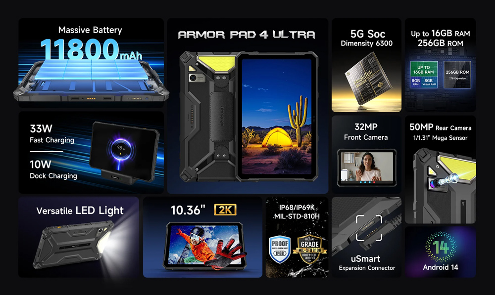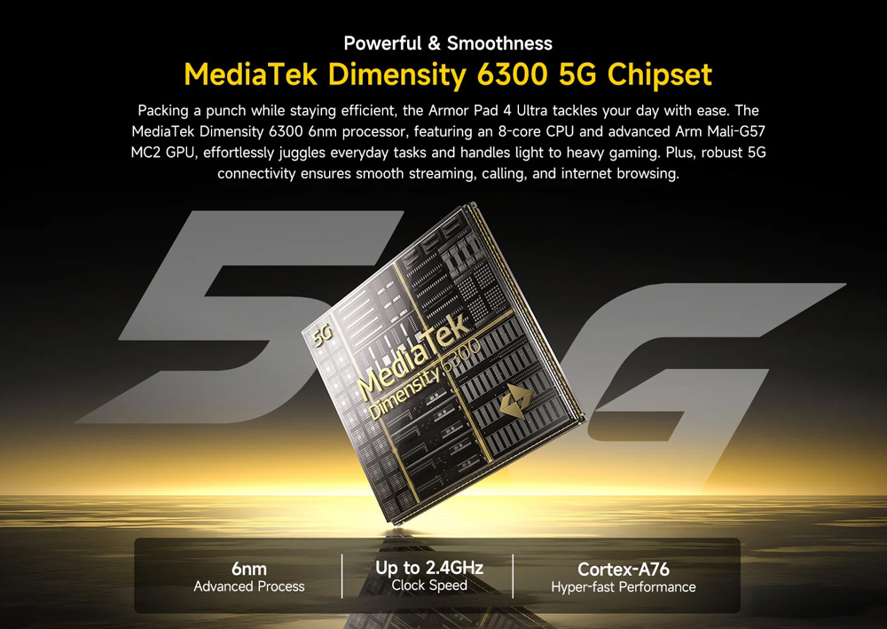Εξοπλισμένο με επεξεργαστή 8 πυρήνων και λειτουργικό Android 14, το Armor Pad 4 Ultra προσφέρει υψηλή απόδοση για απρόσκοπτη περιήγηση στο διαδίκτυο, παιχνίδια, πολυμέσα και πολλά άλλα.