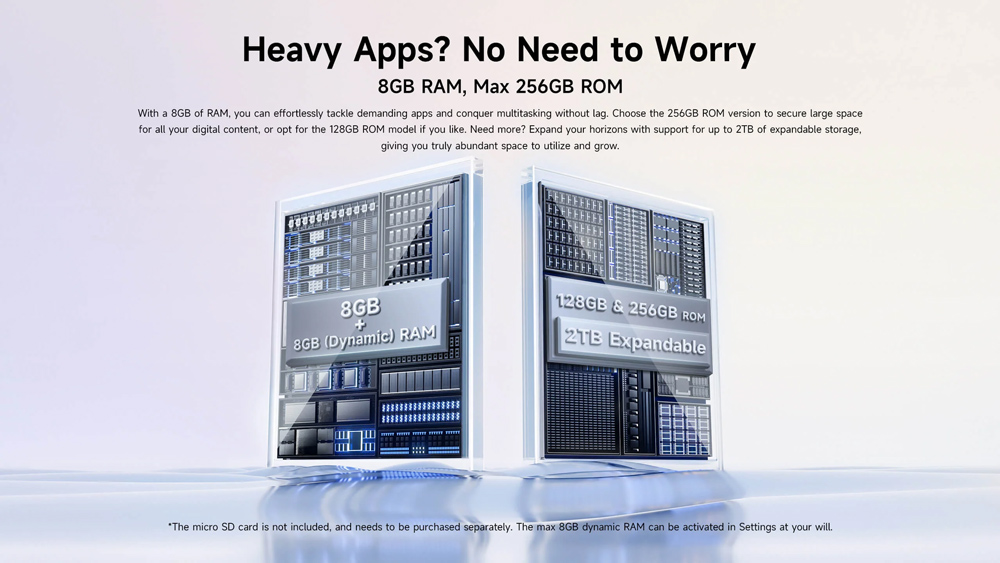 Με 8GB (+8GB virtual) RAM και 256GB ROM για να αποθηκεύετε τα αγαπημένα σας αρχεία, φωτογραφίες και βίντεο. Επιπλέον, προσφέρει την δυνατότητα να επεκτείνετε τον χώρο αποθήκευσης του tablet με κάρτα micro SD έως 2TB.