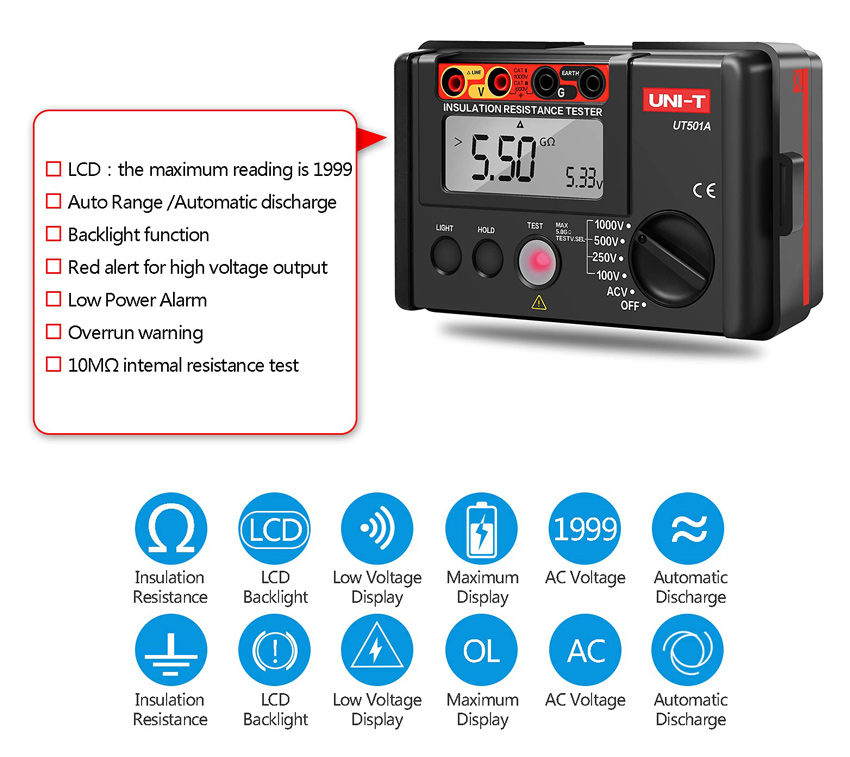 Τα tester μόνωσης της σειράς UT500 χρησιμοποιούνται για τη μέτρηση της αντίστασης μόνωσης του ηλεκτρικού εξοπλισμού και των οικιακών συσκευών. Αυτό γίνεται μετρώντας την αντίσταση μόνωσης μεταξύ ηλεκτρικών κυκλωμάτων ή μεταξύ κυκλωμάτων και γείωσης. Η σειρά UT500 μπορεί να μετρήσει την αντίσταση μόνωσης, την Τάση AC, τη χαμηλή αντίσταση, το PI (Polarization Index) και το DAR (Dielectric Absorption). Αυτά τα εργαλεία διασφαλίζουν την ασφαλή και σωστή λειτουργία μετασχηματιστών, γεννητριών, κινητήρων υψηλής τάσης, πυκνωτών ισχύος, καλωδίων τροφοδοσίας, απαγωγών και άλλου είδους ηλεκτρικού εξοπλισμού.