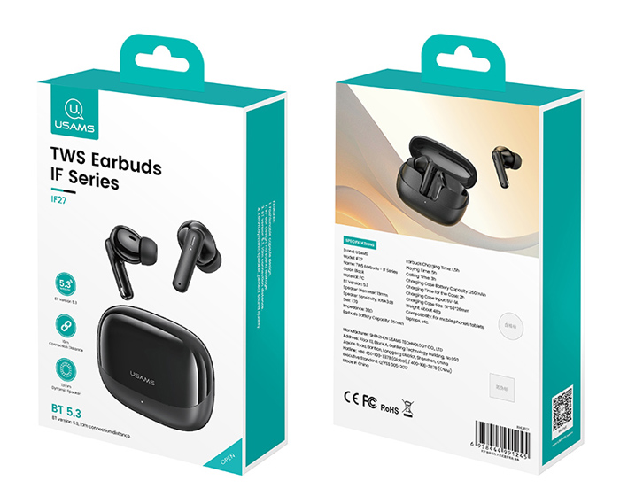 USAMS earphones με θήκη φόρτισης IF27, TWS, Φ13mm, 25/250mAh, μαύρα