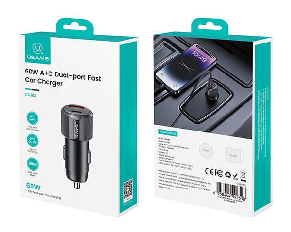 USAMS φορτιστής αυτοκινήτου CC283, USB & USB-C, 60W, μαύρος