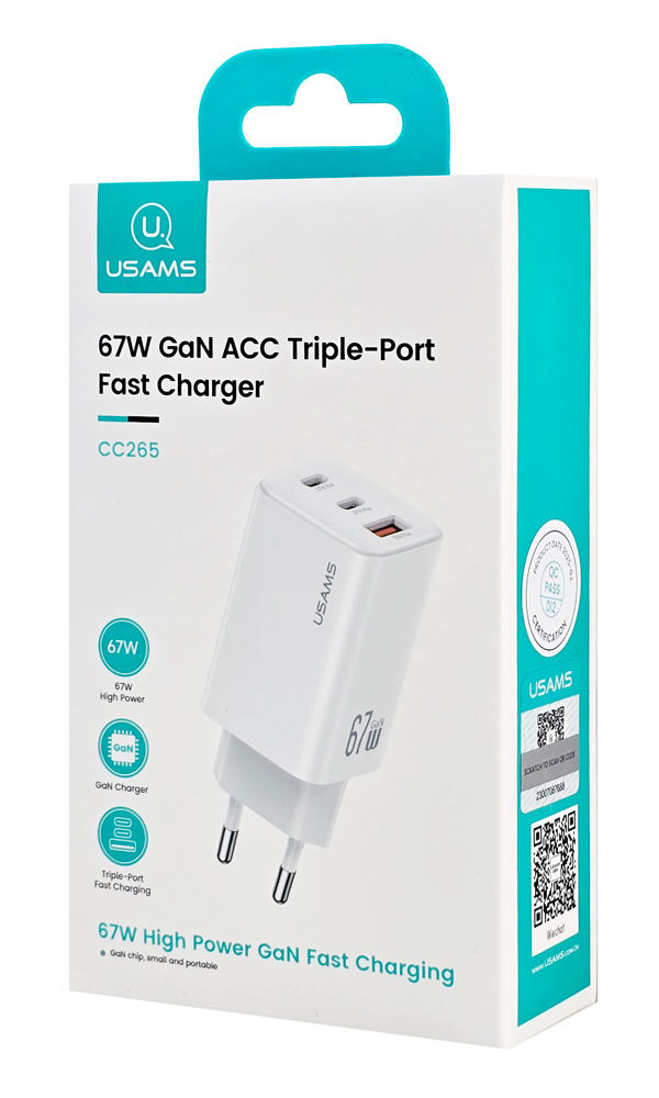 USAMS φορτιστής τοίχου CC265, USB & 2x USB-C, 67W, GaN, λευκός