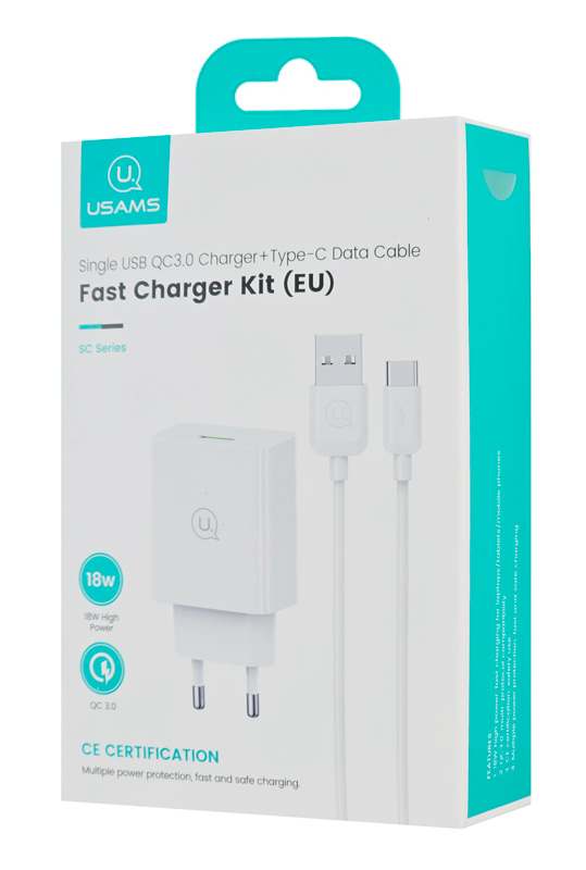 USAMS φορτιστής τοίχου SCXLTZ02 με καλώδιο USB-C, USB, 18W, λευκός