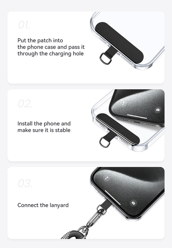 Είναι ρυθμιζόμενο και αποτελείται από 2 μέρη, το κορδόνι και ένα υφασμάτινο κομμάτι το οποίο τοποθετείται στο εσωτερικό της θήκης του κινητού, επιτρέποντας το κρέμασμα του από τον γάντζο του κορδονιού.
