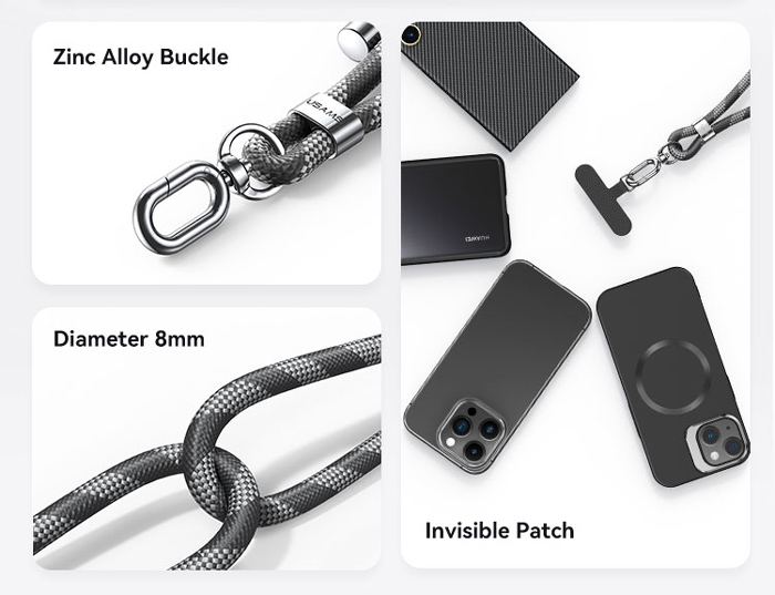 Είναι ρυθμιζόμενο και αποτελείται από 2 μέρη, το κορδόνι και ένα υφασμάτινο κομμάτι το οποίο τοποθετείται στο εσωτερικό της θήκης του κινητού, επιτρέποντας το κρέμασμα του από τον γάντζο του κορδονιού.