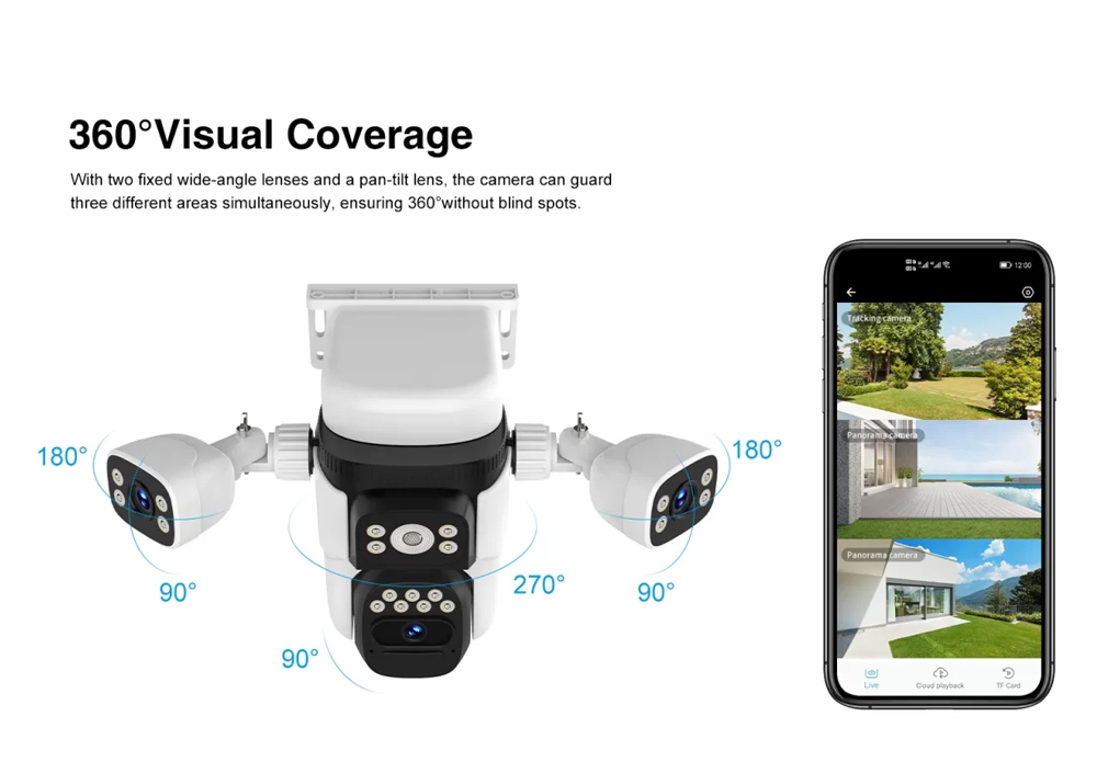 Ενσωματώνει 3 φακούς που επιτρέπουν μεγαλύτερη κάλυψη στον χώρο και υποστηρίζει PTZ λειτουργία που σας επιτρέπει την οριζόντια και κάθετη μετακίνηση της κάμερας μέσω της εφαρμογής.