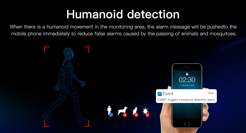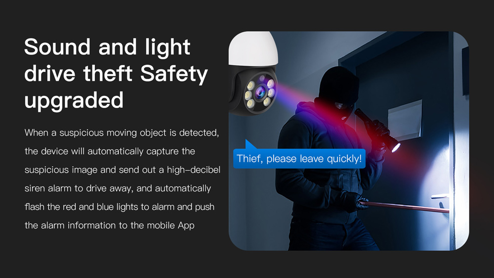 Alarm detection: Motion detection, Humanoid detection, Humanoid tracking, Absence detection, Alarm voice prompt, flash & irradiation, LED light timing ON & OFF